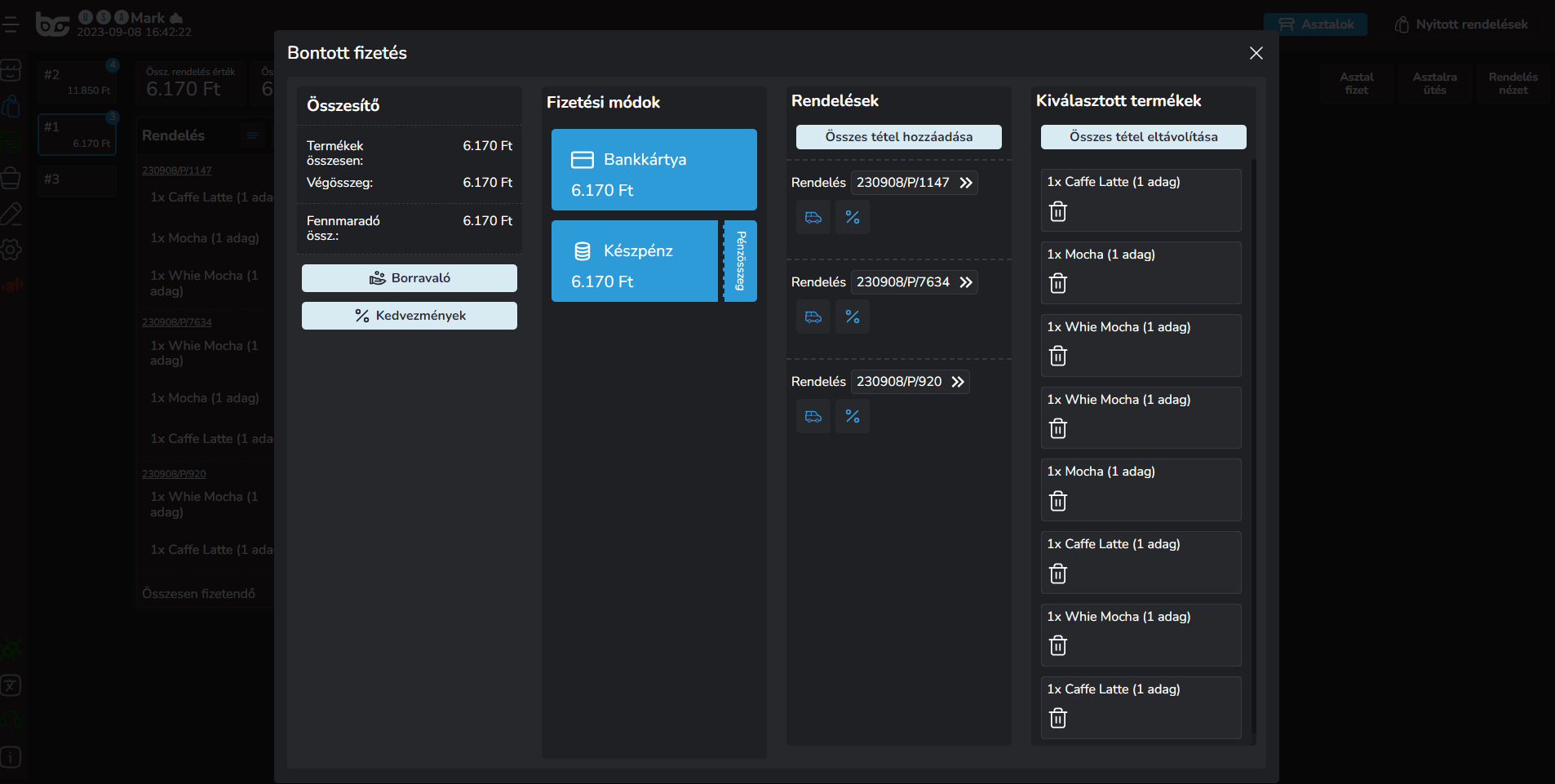 A BarSoft rendszere nagyon egyszerűen lekezeli a bontott fizetést, abban az esetben, ha a vendégek külön, vagy bizonyos tételeket szeretnének csak fizetni a rendelésekből.