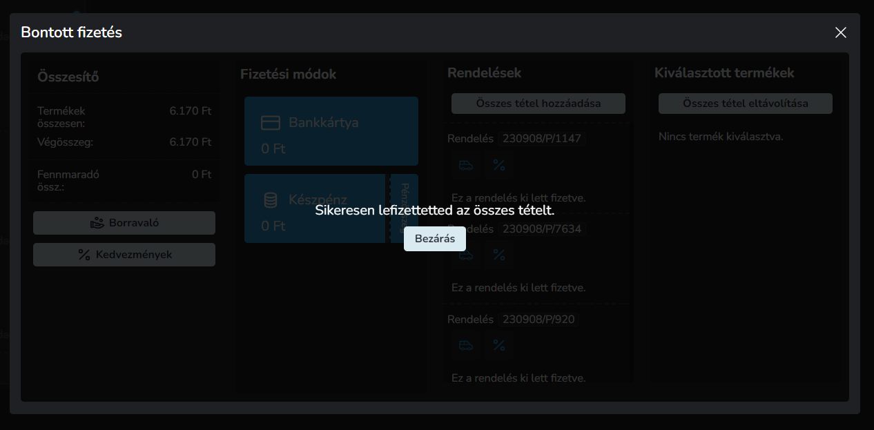 Amint kifizettettük az összes tételt, egy "Sikeresen lefizettetted az összes tételt" üzenet fog megjelenni. A "Bezárás" gombra kattintva bezáródik az ablak.