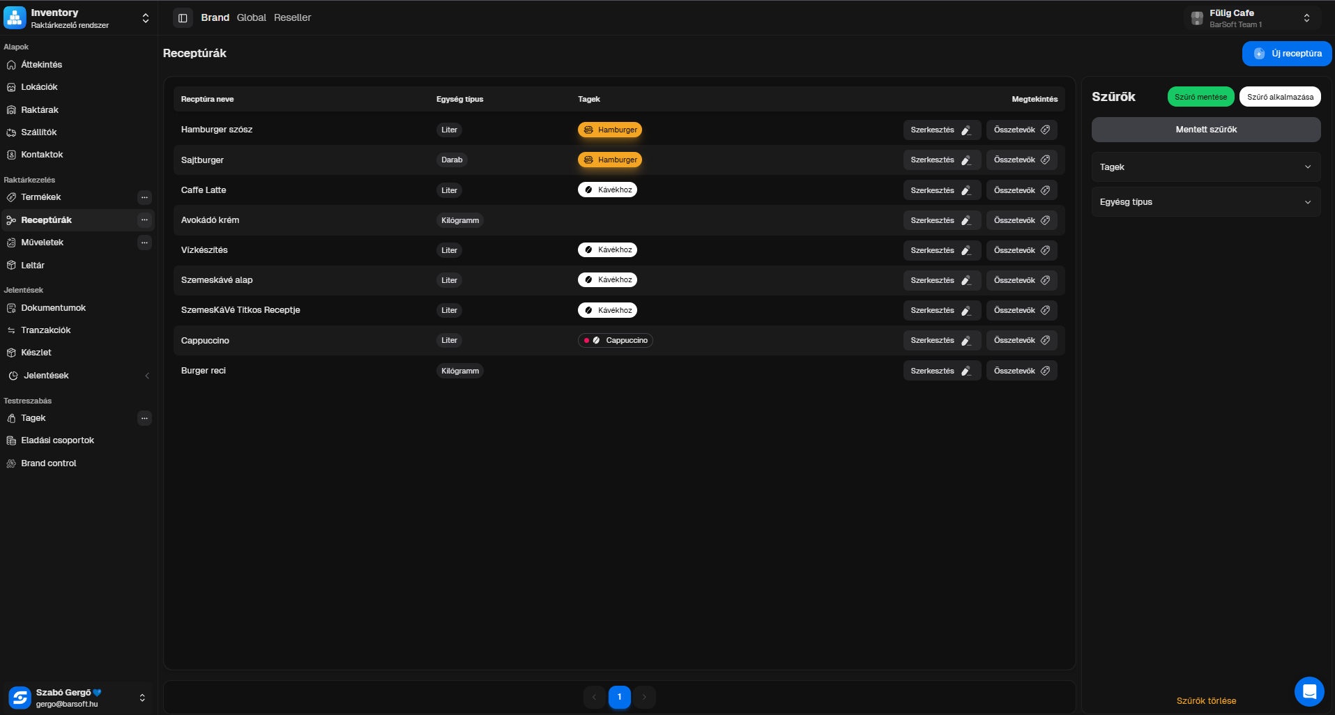 Minden receptúrához szintén rendelhetünk tageket, ennek célja az egyszerűsített szűrés, kategorizálás és az, hogy a lehető legjobban tudjunk eligazodni a raktárkezelő rendszerében.